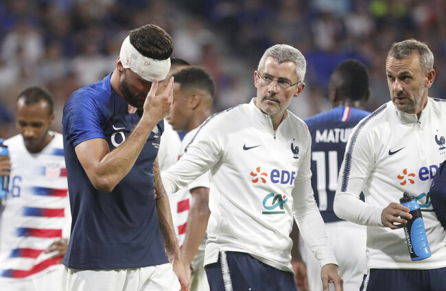 FRANCE SUFFERED AN injury scare in their final World Cup warm-up as Olivier Giroud was involved in a clash of heads with Matt Miazga.