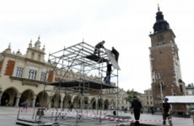 Workers build a stage area in the main square, ahead of the Euro 2012 kick-off, in Krakow today. Kirsty Wigglesworth/AP/Press Association Images