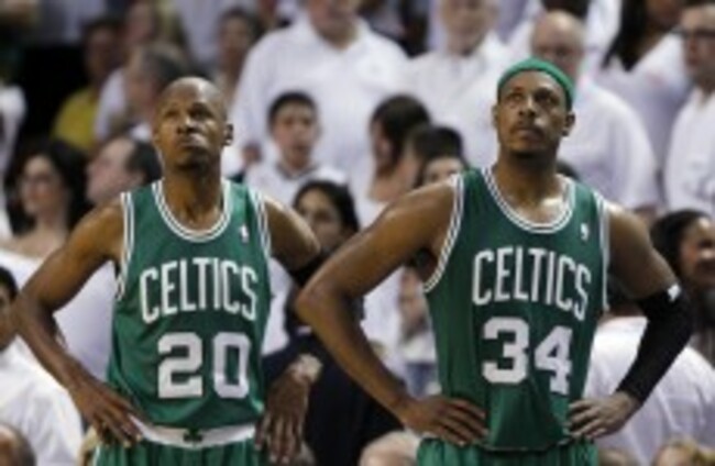 Boston Celtics' Ray Allen and Paul Pierce can only watch on as the Miami Heat make their way to the NBA Finals. Lynne Sladky/AP/Press Association Image