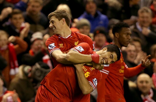 What makes it easier to block the negatives from your mind is that Luis Suárez from October ‘13 to March ‘14 happened more than any top-flight footballer in England ever has. It’s like playing with 12 men. Possibly 13. He is both a nine and a false nine and he does bits out wide as well. He scores a header from 18 yards and every brilliant performance he puts in, Daniel Sturridge strives to match. The day Suárez heads home from a mile out as part of a hat-trick, Sturridge somehow lobs a keeper who isn’t off his line. Suárez gets two at Stoke, Sturridge makes it five by doing keepy-ups on the goal line.