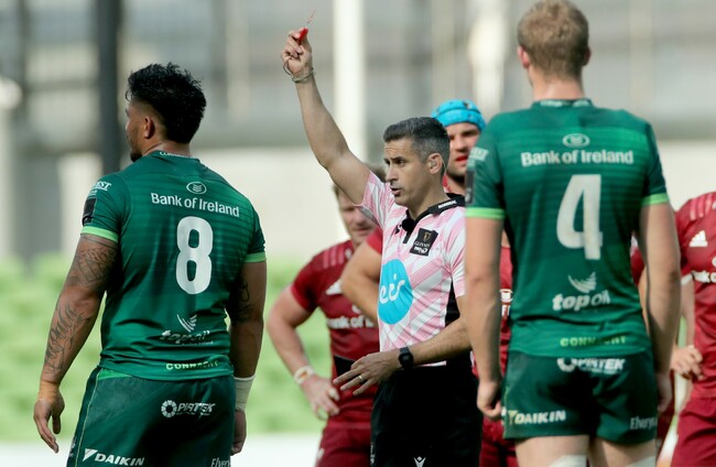 Abraham Papali'i receiving a red card from Frank Murphy during Connacht's defeat to Munster during the restart of rugby last August. James Crombie/INPHO
