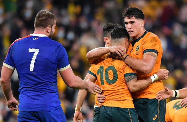 France were far more polished than Australia, but the hosts hauled themselves back seven minutes before the break after a lineout set-piece. It ended with hooker Brandon Paenga-Amosa flopping over after a powerful drive with Noah Lolesio nailing a tricky conversion to take them to the break 15-7 behind.
