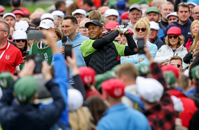 Nobody draws eyeballs quite like Tiger Woods: Newstalk played out a six-second interview of searing Woods insight – “I’m here to have fun” – simply because it was Tiger Woods. Stars trailed in his wake: Michael Carrick flew in solely for the chance to watch Woods in the flesh for the first time, John Kiely stood for a photograph with Woods and JP McManus on the first tee; in fact, Woods may now have posed alongside a Limerick hurler more often than Liam McCarthy.