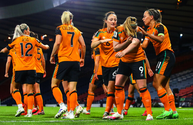 Ireland’s Amber Barrett celebrates scoring their first goal with teammates as she gestures to the black armband worn in memory of those affected by the tragedy in Creeslough in Co. Donegal. Ryan Byrne/INPHO