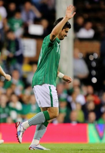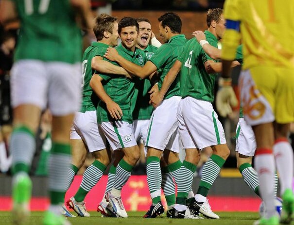 • Shane Long is congratulated by Kevin Doyle and Stephen Kelly after scoring 11/9/2012