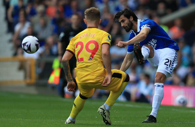 Sam Curtis closes down Andre Gomes during Sheffield United's 1-0 defeat at Everton. Action Plus Sports/Alamy Stock Photo