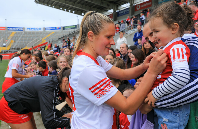 Ciara O'Sullivan of Cork signs the jersey of a young Cork supporter after the final whistle. Natasha Barton/INPHO