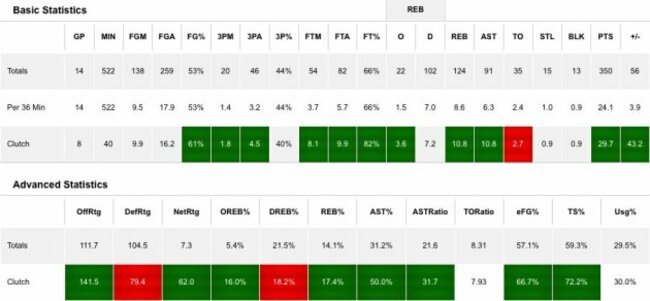 It’s pretty simple: a green box indicates that his production in that stat gets at least 10 percent better in the clutch (the last 5 minutes of a game within 5 points).