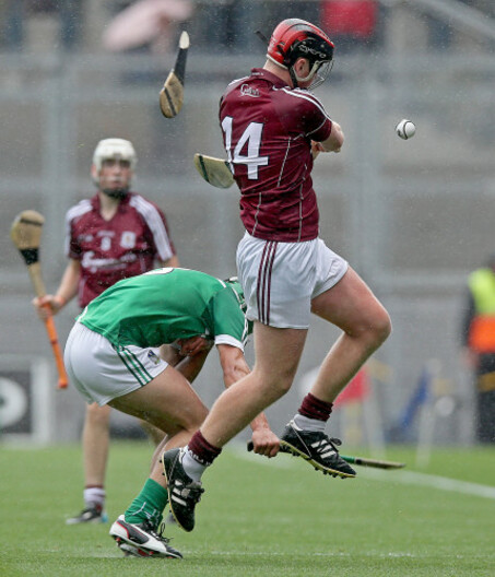 Limerick's Robbie Hanley see his hurley come off second best against Galway