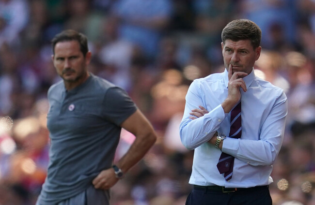 Frank Lampard and Steven Gerrard on the sidelines at Villa Park. PA