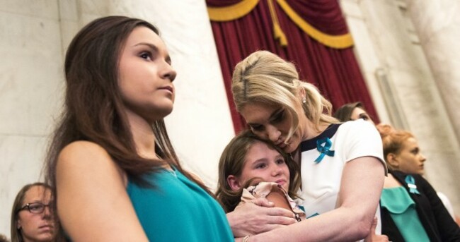 Sen. Jerry Moran, R-KS, (center left) and Sen. Richard Blumenthal, D-CT, speaks alongside victims of convicted child molester and former Team USA Olympic doctor Larry Nassar, during a press conference on abuse within gymnastics and youth sports and the necessary reforms needed to keep young athletes safe. UPI / PA Images