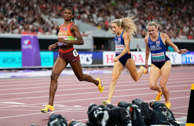 In an extremely fast race, defending world champion Mary Moraa of Kenya raced into the lead, Hodgkinson hugging the curb on her shoulder.