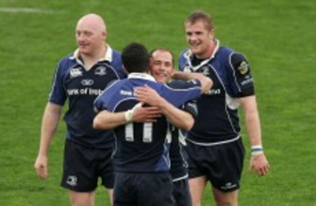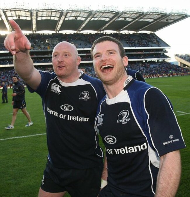 Jackman celebrates with Gordon D’Arcy after Leinster defeated Munster in the Heineken Cup semi-final in 2009. (Julien Behal/PA Wire)