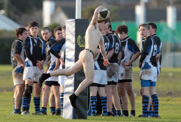 A streaker interrupts the game between Mount Temple and Newpark in the McMullen Cup semi-final at Seapoint Rugby Club in November.Source: INPHO/Morgan Treacy