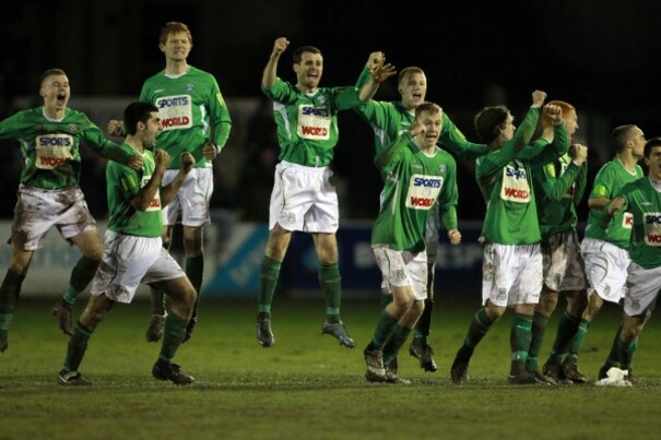 Bray players celebrate their win over Monaghan United in a dramatic Airtricity League Promotion/Relegation Play-Off second leg at the Carlisle Grounds.Source: INPHO/Donall Farmer