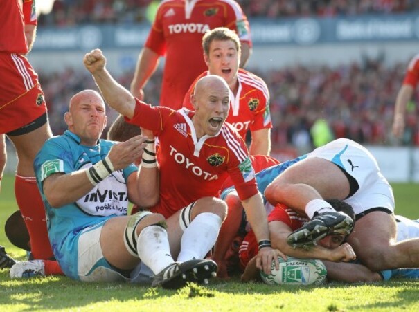 Munster's Peter Stringer celebrates as Doug Howlett scores a try