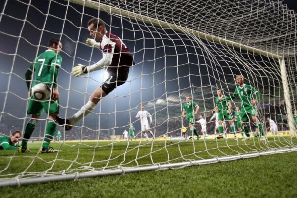Ireland goalkeeper Shay Given can't keep out Jan Durica's header in Slovakia. Source: INPHO/Donall Farmer