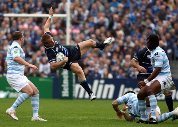 The high-flying Leinster's Luke Fitzgerald tackled by Andrea Masi of Racing Métro 92.Source: INPHO/Dan Sheridan