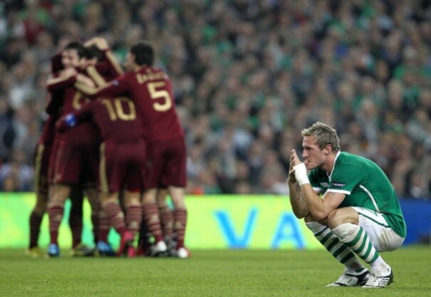 The Russians are coming: Ireland's Liam Lawrence looks dejected as the visitors celebrate their third goal at Lansdowne Road.