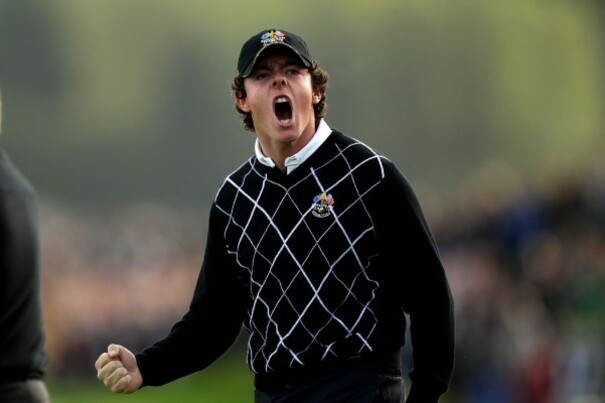 Europe's Rory McIlroy celebrates holing a birdie putt on the 17th green during the Ryder Cup action at Celtic Manor in October.