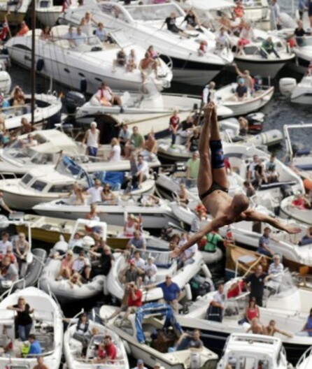 Russian Artem Silchenko dives from the 26.8 metre platform the the 2010 Red Bull Cliff Diving World Series in Kragero, Norway in July.Source: AP Photo/Red Bull, Dean Treml