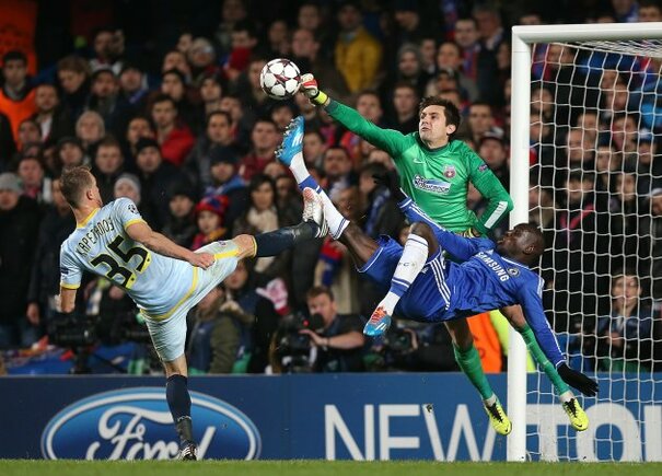 Chelsea's Demba Ba has a shot stopped by Steaua Bucurest goalkeeper Ciprian Tatarusanu