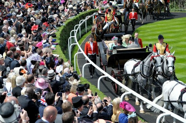 England's Queen Elizabeth II arrives with the Duchess of Cornwall for day two of the Royal Ascot