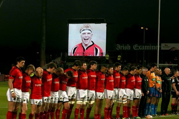 The Munster team observe a minute's silence in memory of Ulster's Nevin Spence