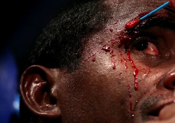 Felix Machado recieves attention from his corner during his fight with Alexei Acosta before it was stopped due to the injury.Source: INPHO/James Crombie