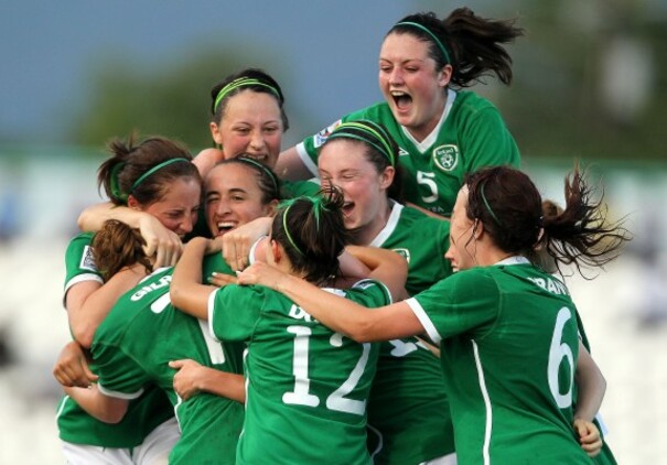 Ireland's Siobhan Killeen is mobbed by team-mates after scoring Ireland's opening goal against Brazil in the FIFA Women’s U-17 World Cup Finals in September. Source: INPHO/James Crombie