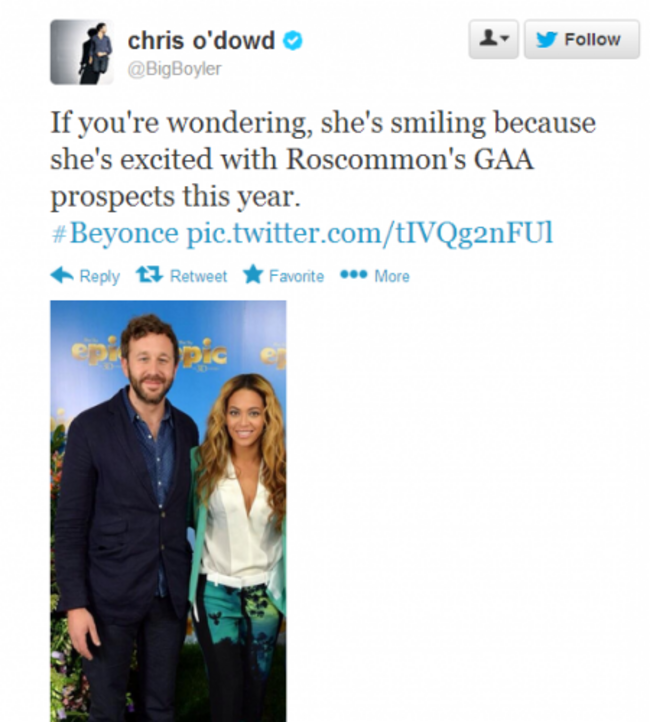 Following in the footsteps of Martin Keown and Tom Cruise, Beyonce is now said to be a big Roscommon GAA fan, if Chris O’Dowd’s Twitter account is to be believed.