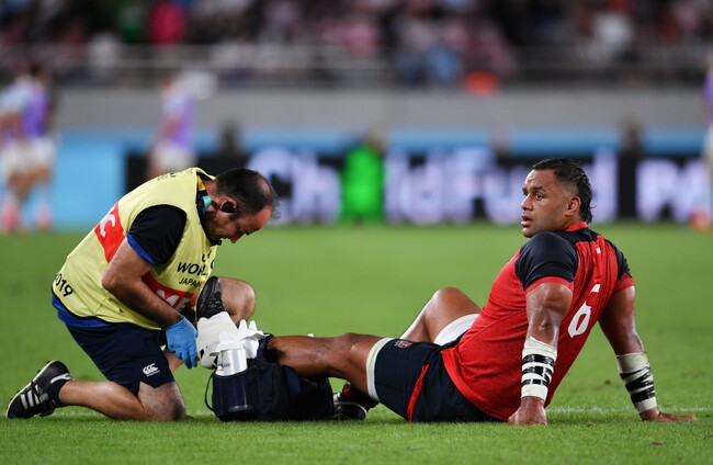 Billy Vunipola receiving medical attention during England's game against Argentina at Tokyo Stadium. Ashley Western