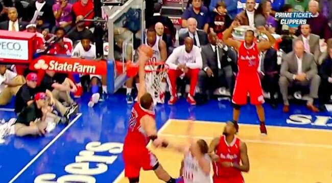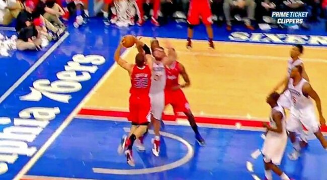 Last night, Blake Griffin threw down an exceedingly difficult jam against the Sixers. He went up planning to dunk with his right hand, but when Spencer Hawes came to defend he somehow contorted his body around Hawes in mid-air, put the ball in his left hand, and dunked.