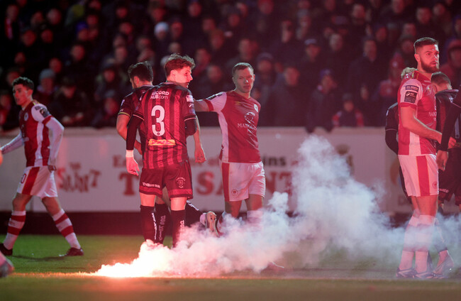 And the Inchicore club are also likely to be hit with a significant fine after play had to be halted for five minutes in the second half when both sets of supporters threw pyrotechnics onto the pitch and produced banners criticising the FAI.