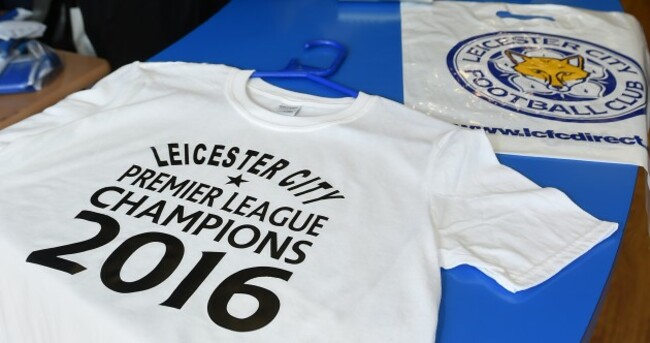 A t-shirt celebrating Leicester City as Premier League Champions 2016 in JC Sports in Leicester. The product will be sold in the shop from Monday if Leicester City clinch the Premier League title this weekend. Joe Giddens