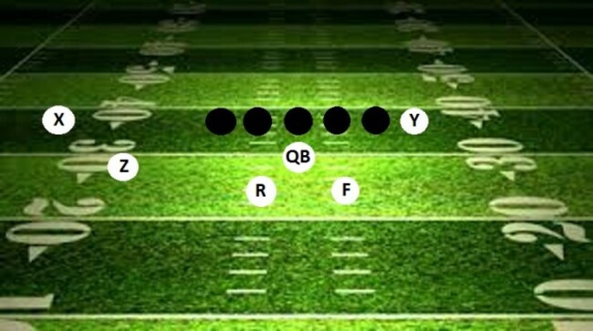 So-called because it spreads the field, this is a very effective pass formation because of the number of receivers but also works well in the run game because it forces the defence to respect the pass which means they can’t be as aggressive when defending the run.