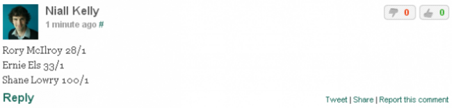 For example: Rory McIlroy (28/1), Ernie Els (33/1) and Shane Lowry (100/1) = 161/1