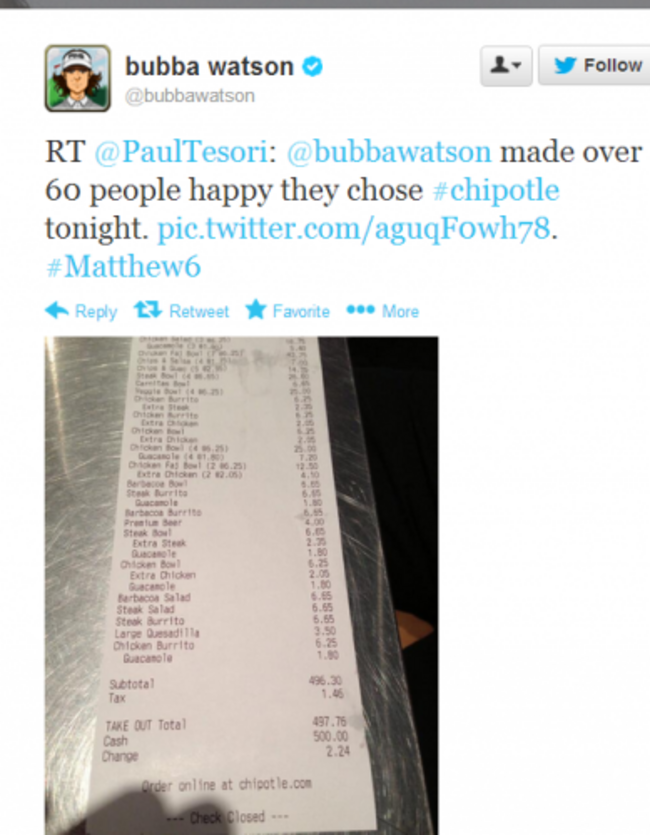 60 people Bill Bubba Watson Character chipotle generosity Hovercraft Twitter