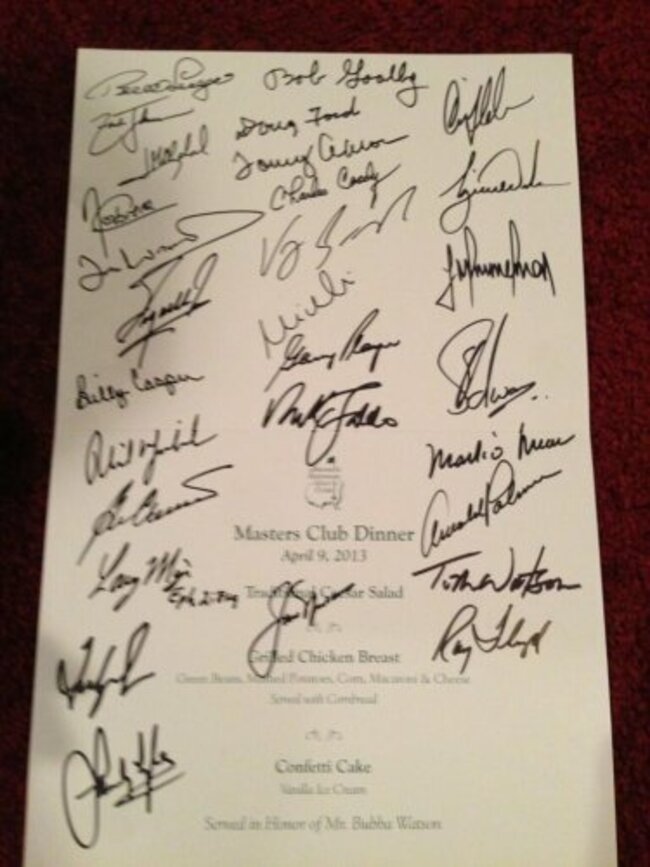 With 30 former winners in attendance, 2012 champ Bubba Watson had the honour last night — and one of the world’s most colourful golfers served up a meal perfectly in keeping with his personality.