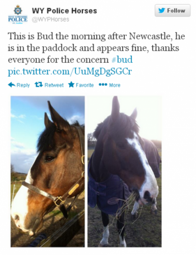 Following enquiries, West Yorkshire Police tweeted a picture of Bud the horse in his paddock this morning and thanked the public for their concern.