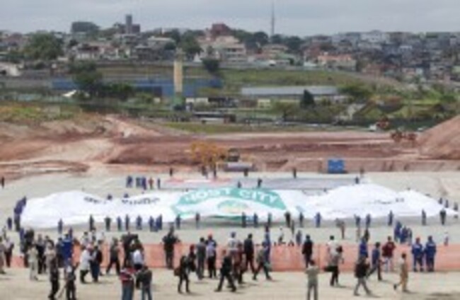 A sign is displayed at the site where Corinthians' new stadium is being built, after the FIFA confirmed the city of Sao Paulo as the host of the opening ceremony for the 2014 World Cup. Andre Penner/AP/Press Association Images