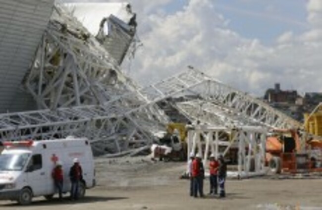 A giant crane collapsed as workers tried to put the final part of the roof on the stadium, which will host six matches at the 2014 FIFA World Cup.