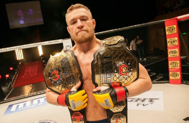 Conor McGregor with the Cage Warriors featherweight and lightweight belts after defeating Ivan Buchinger at The Helix in December 2012. Dolly Clew/Cage Warriors