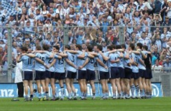 The Dublin senior football team sing the national anthem before kick-off at Croke Park. Inpho.