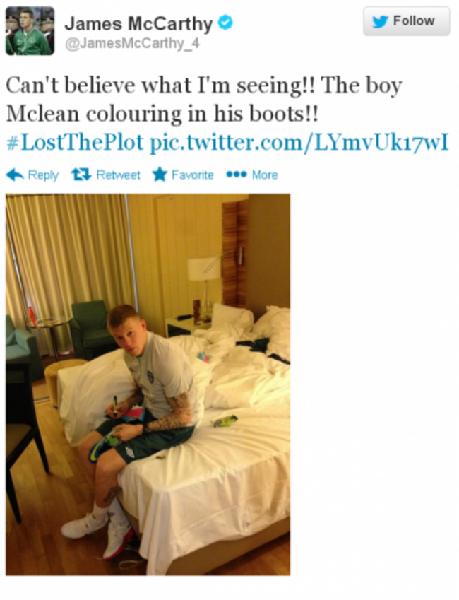 James McCarthy certainly seemed to get a case of the giggles when he (maybe) came out of the bathroom to find his roomie James McClean scribbling on his boots.