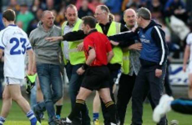 Cavan manager Peter O’Reilly was the first to remonstrate with the official after his side’s narrow 0 – 11 to 0 -10 defeat, but he subsequently pushed supporters and players attempting to do the same.