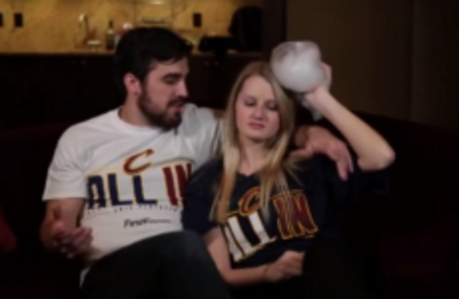 At the end of the ad, she is shown with an ice pack held to her head and wearing a Cavs’ shirt.