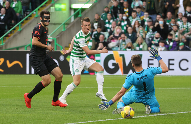 Celtic had a let-off in the opening moments of the second half when Carl Starfelt went in with a reckless penalty-box challenge which appeared to hurt his opponent. The referee saw nothing wrong with it and the hosts survived when Jakub Povazanec shot just over.