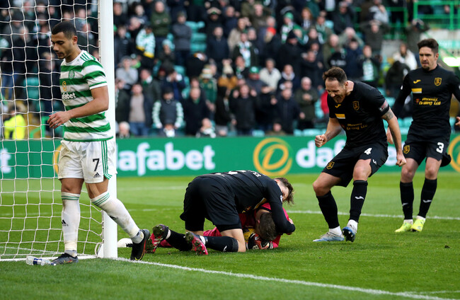 Instead it was Obileye who was soon punished. Giakoumakis stepped up despite Josip Juranovic scoring from the spot the previous weekend, and the Greek striker produced an unconvincing effort which Stryjek held.