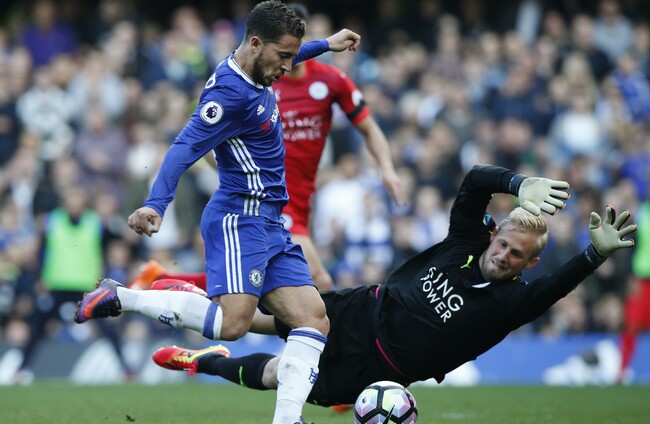Pedro, lying on the turf after slipping, poked a pass to Hazard, who scampered clear as the ball bounced fortuitously off his shoulder before rounding Schmeichel and slotting into the unguarded net for his first Chelsea goal since August.